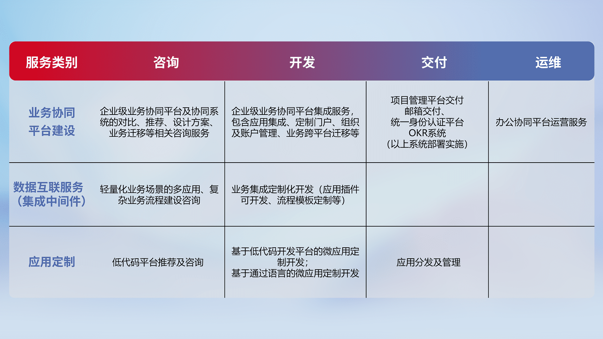 针对钉钉、、企微、、IDaas等平台级产品提供产品的规划、、、方案、、、、交付、、、、定制化开发等服务,,,实现如统一协同办公、、、、智能客户服务、、、、混合会议管理、、智能数据查询、、等业务场景,,实现数字化转型。。