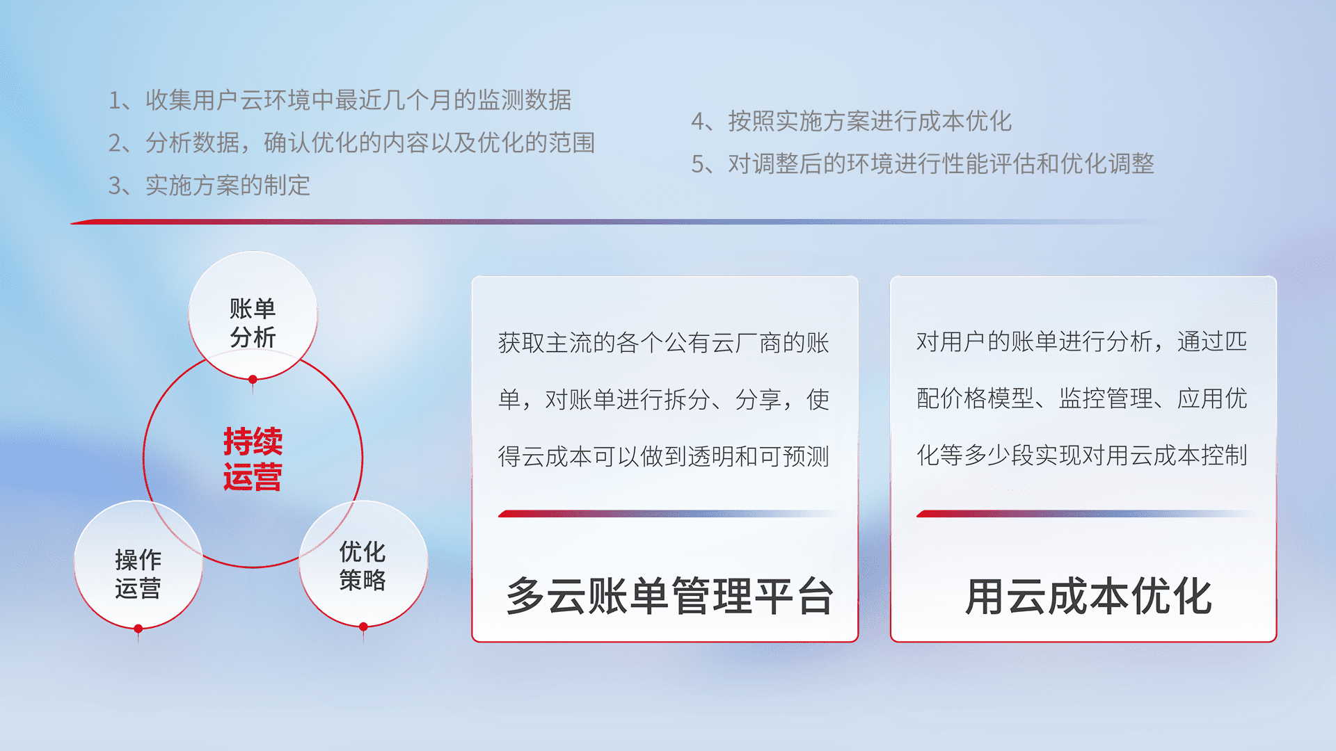 通过多云纳管,,,,以统一的资源数据模型把客户的云资源进行抽象和封装,,,,进而实现对多云资源的统一操作,,,保障云资源管理的可靠性、、、稳定性与可用性。。。。量身定制化运维内容,,,,配置、、、、开发运维、、、、补丁管理、、、备份、、、、监控、、、、认证和访问管理、、审计和日常巡检等,,,,保障在用云过程中的可靠度,,,稳定度以及高可用率。。。。